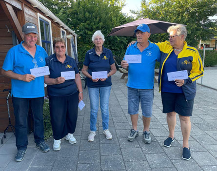De kampioensbeker werd uitgereikt aan Giel en Joke hun namen worden erop gegraveerd . Er kan worden teruggekeken op een sportieve gezellige boulemiddag met dank aan de vrijwilligers
